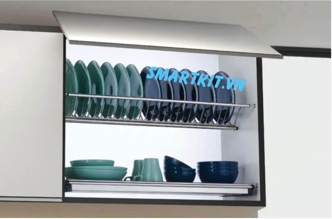 GIÁ ĐỂ BÁT ĐĨA 2 TẦNG CÓ KHAY INOX 304 là phụ kiện bếp được dùng để lắp đặt cho tủ bếp trên chứa bát đĩa tiện dụng.