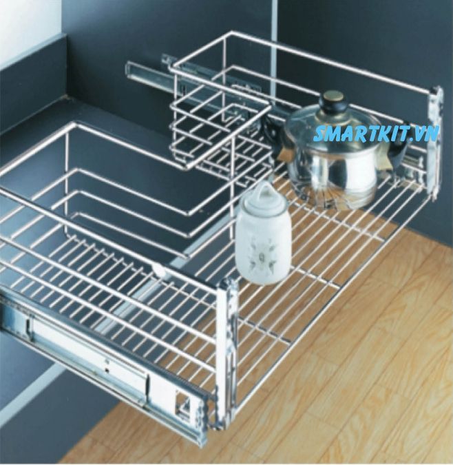 Giá để xoong nồi bát đĩa dưới chậu rửa tủ dưới là một giải pháp lý tưởng để tối ưu cho không gian bếp. Theo đó, phụ kiện nhà bếp được thiết kế lắp đặt bên trong tủ sử dụng ray giảm chấn có sức chứa lớn sẽ giúp cho gia chủ giải quyết lượng lớn xoong nồi, bát đĩa trong một cách nhanh chóng.